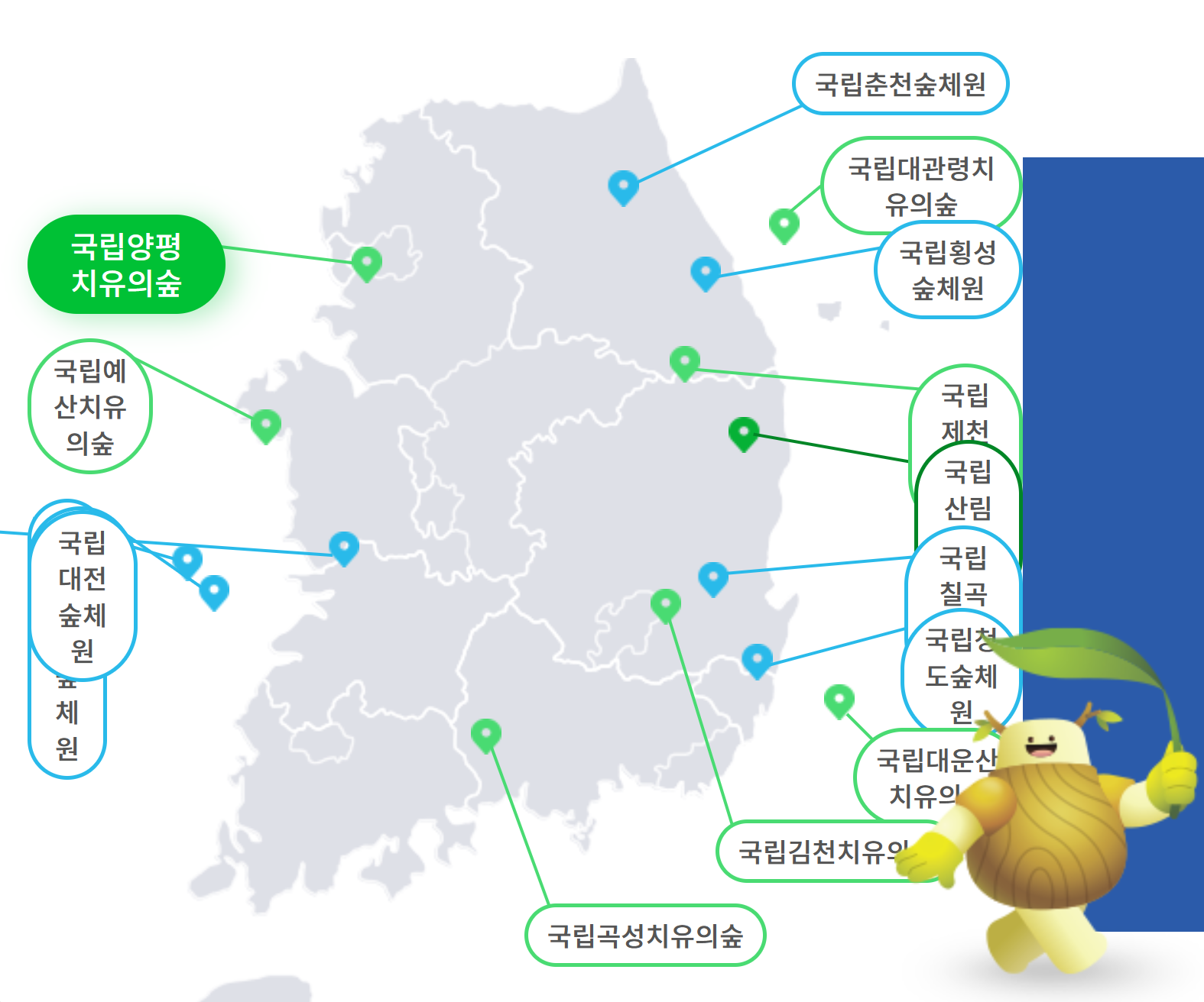 - 프로그램 : 숲산책, 숲힐링미션, 수水치유체험 프로그램 보유