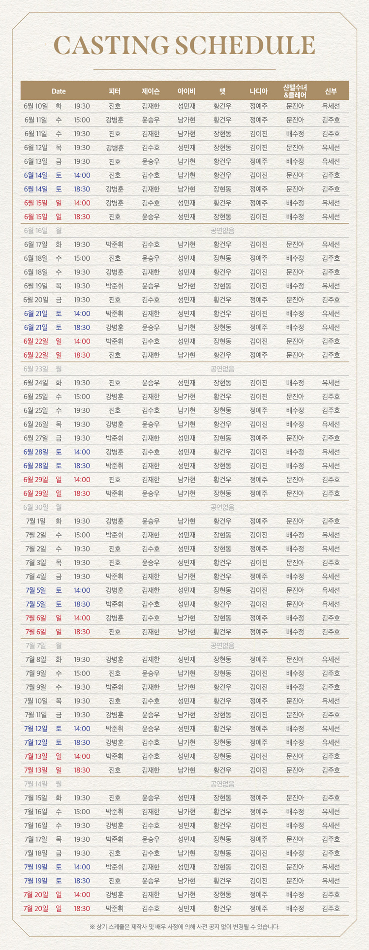 3. 최근 이슈로 인한 캐스팅 변경으로 공연 환불을 가능하오니, 예매 홈페이지 참고 바랍니다.