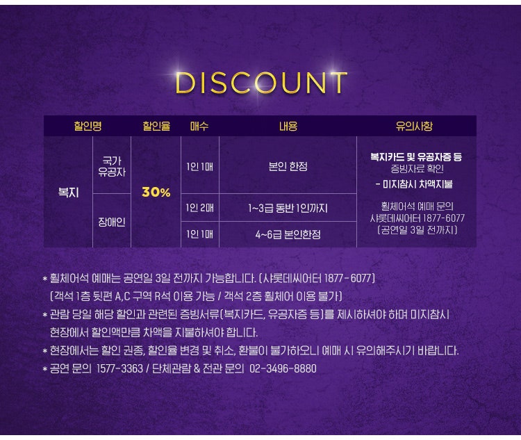 1. 네이버 예약과, Yes 24, 인터파크 공연 예매 가능하며, 각 예매 사이트 내에서 프로모션 할인하는 이벤트가 있으며, 아래 복지 할인도 있으니 할인정보 체크하시어 효율적인 예매 하시길 바랍니다.