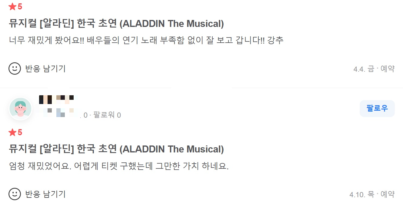 뮤지컬 알라딘 공연 후기