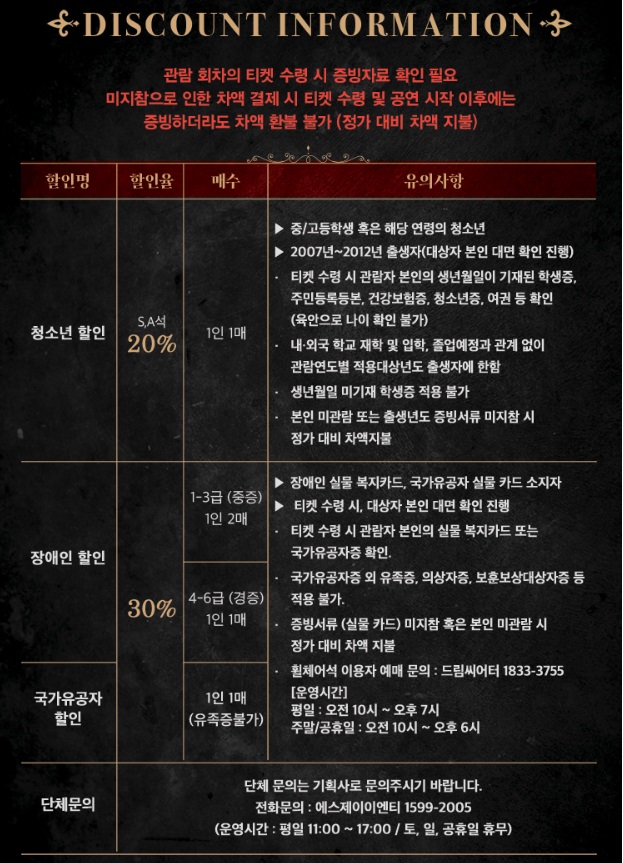인터파크 내에서 진행하는 프로모션 이벤트 등 요금 할인 제도가 준비되어 있으니, 공연 예매 전 참고 바랍니다.