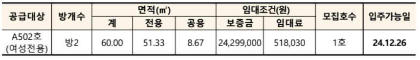 • 해당주택은 입주자모집공고일(2024.10.07.) 현재 미혼의 청년을 대상으로 입주자를 모집합니다.